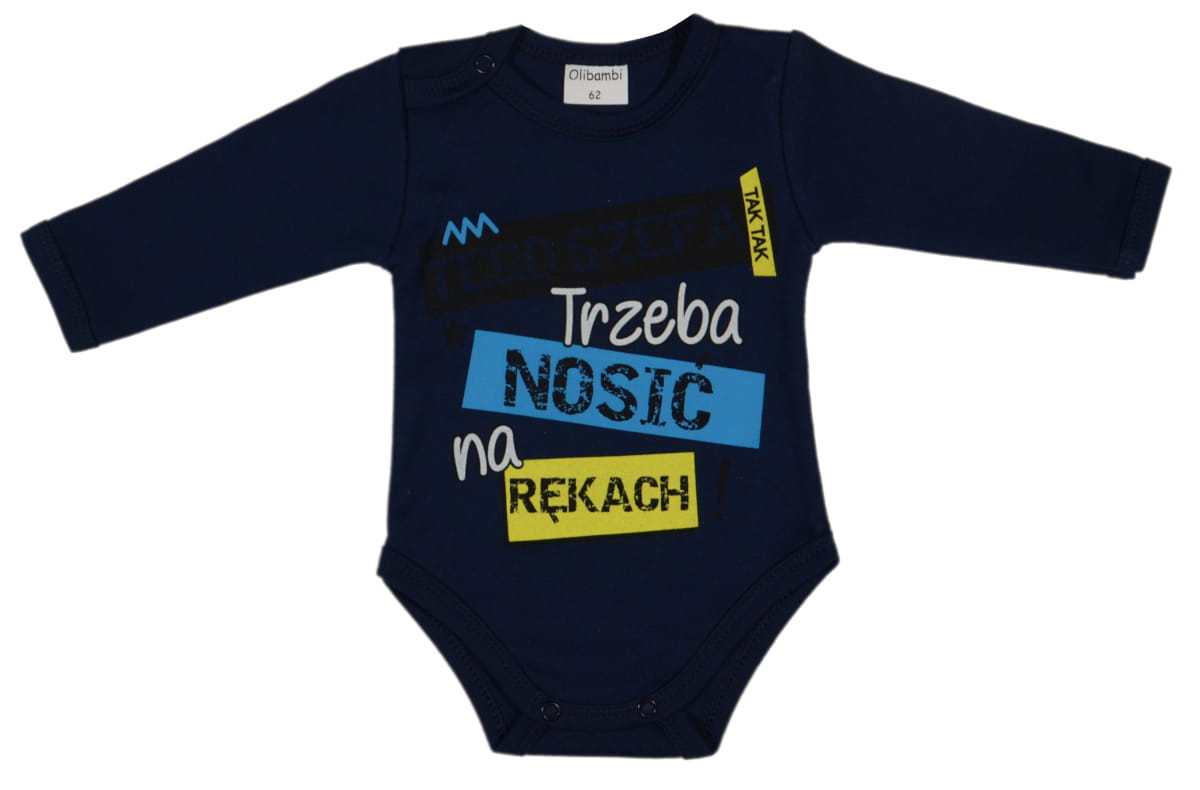 Bodziaki z długim rękawem w kolorze głębokiego granatu i zabawnym napisem, to idealna propozycja, która powinna znaleźć się w szafie Twojej pociechy. Wywoła uśmiech na twarzy niejednego dorosłego, świetnie zaprezentuje się na rodzinnych zdjęciach, a Twojemu dziecku zapewni wyjątkowy komfort!